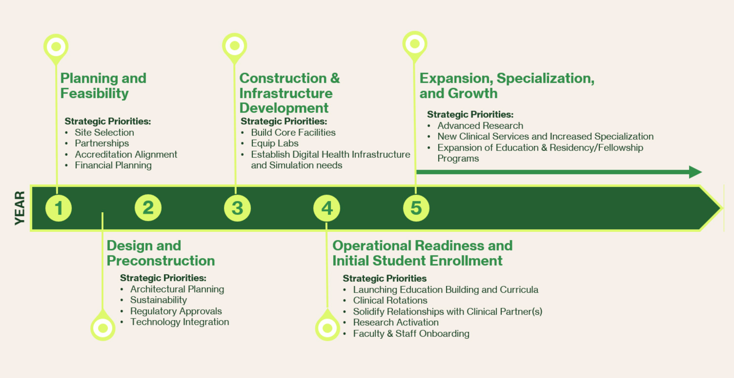 From its initial conception through full accreditation, the development of facilities follows a trajectory that aligns with accreditation milestones, educational needs, research aspirations, and clinical partnerships. Below, we explore the phased progression of a medical school’s physical infrastructure and how it evolves into a fully realized academic health campus from Day-1 to Years 10+.